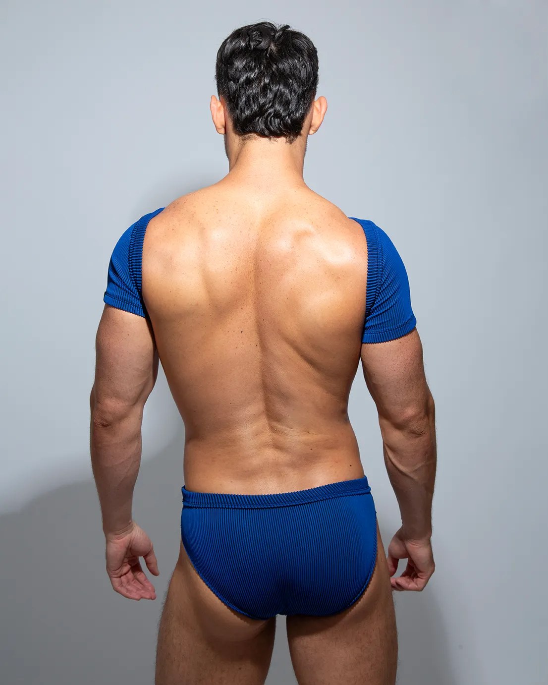 Kali Blue bodysuit made with ribbed fabric with armholes.
