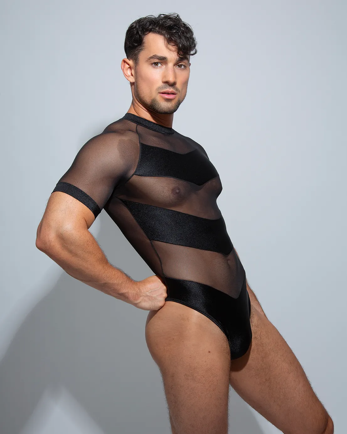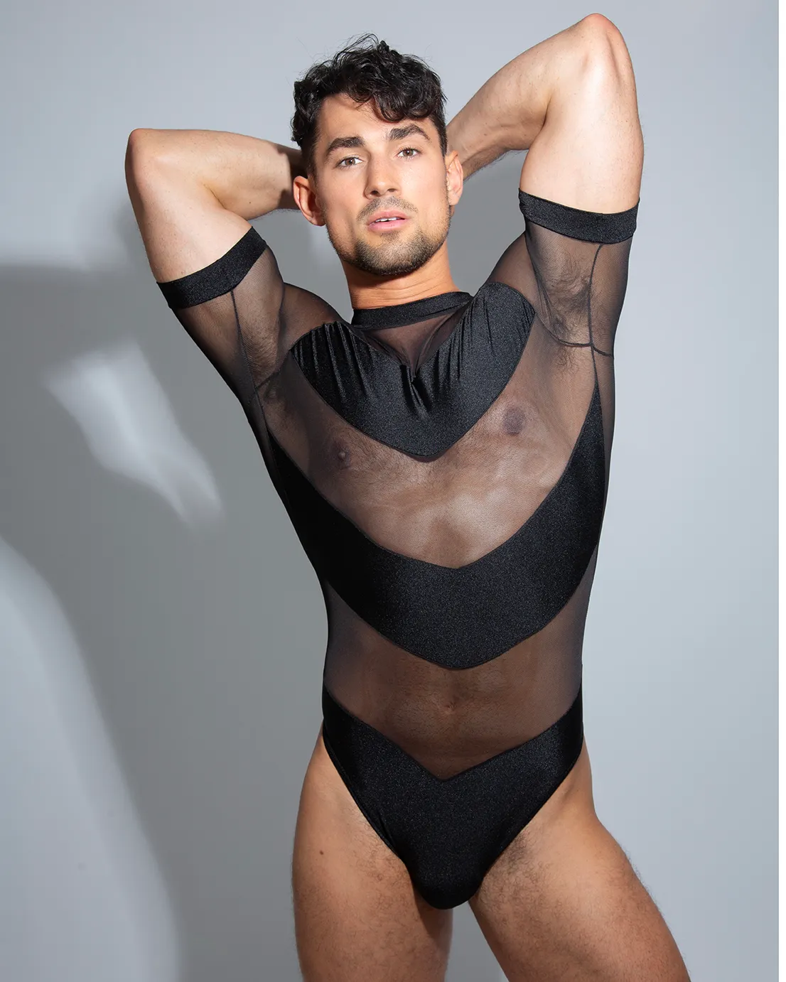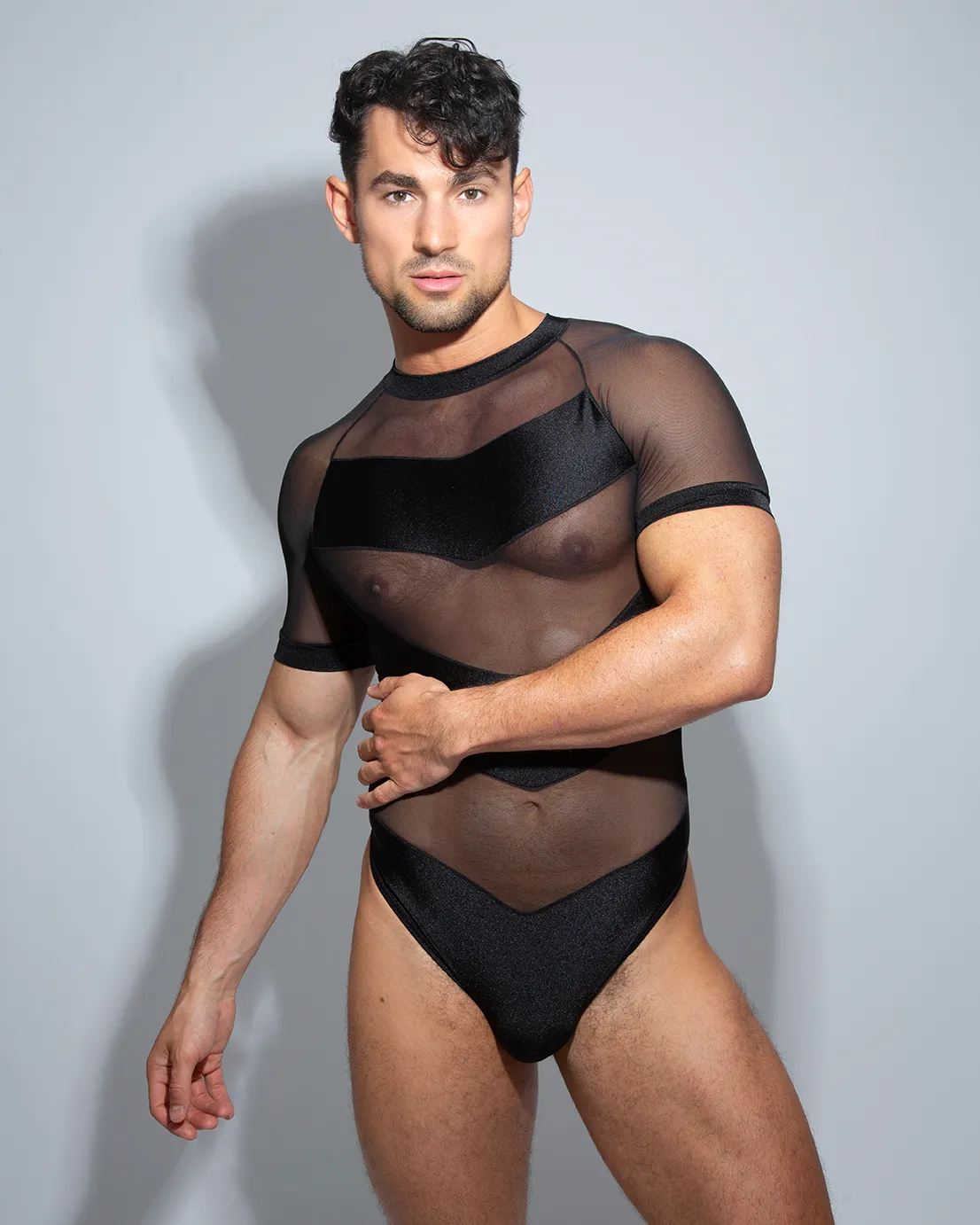 Bodysuit Asmodeo Negro manga corta con diseño en picos en trasparencia para estilizar mejor el cuerpo y marcar la cintura.