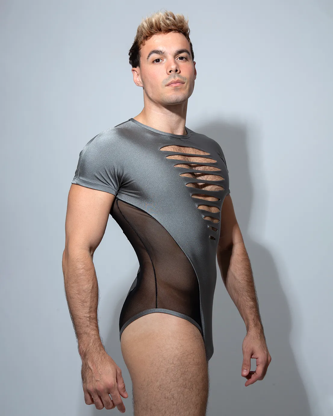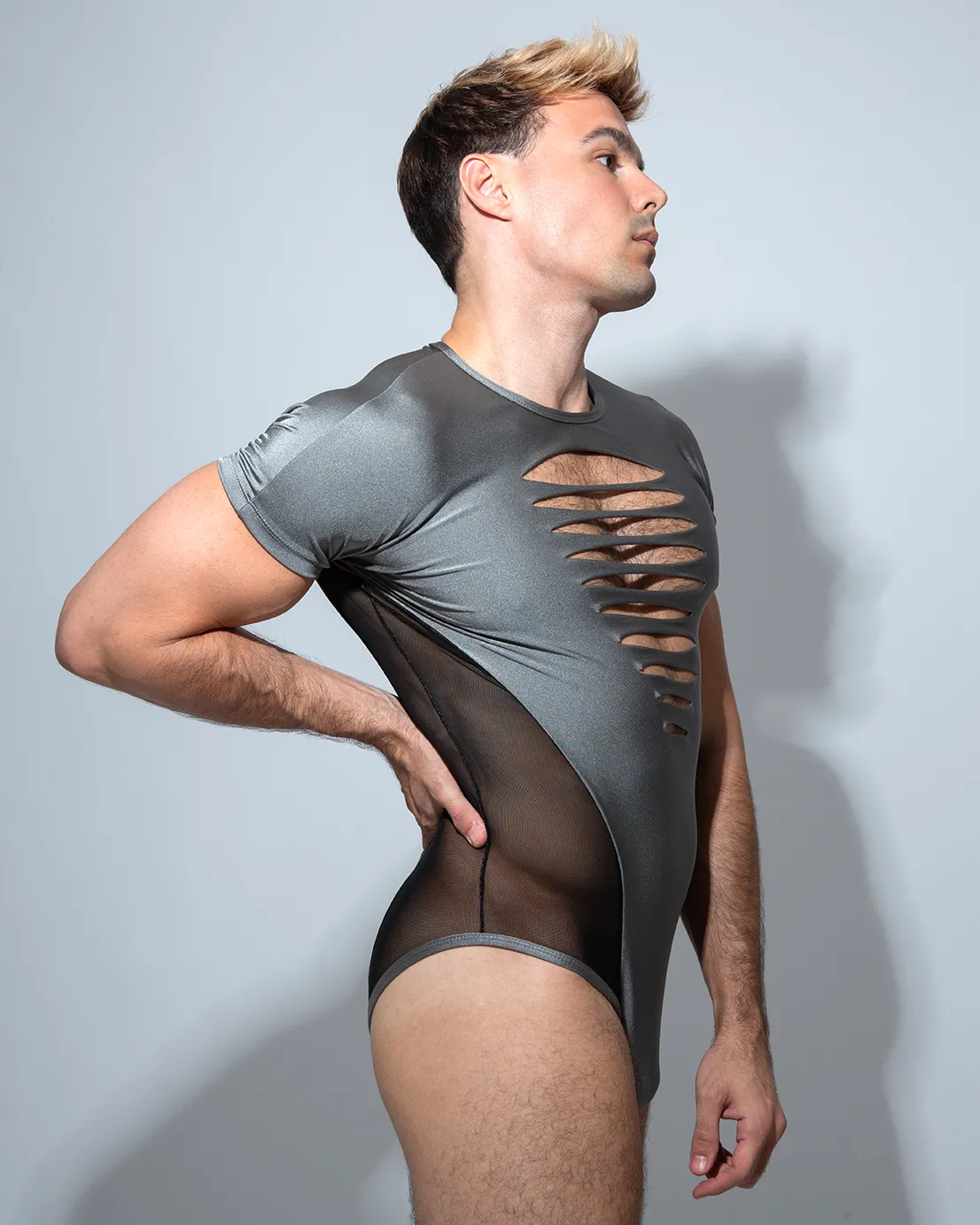 Bodysuit Loki Gris con trasparencia lateral y cortes en el pecho.