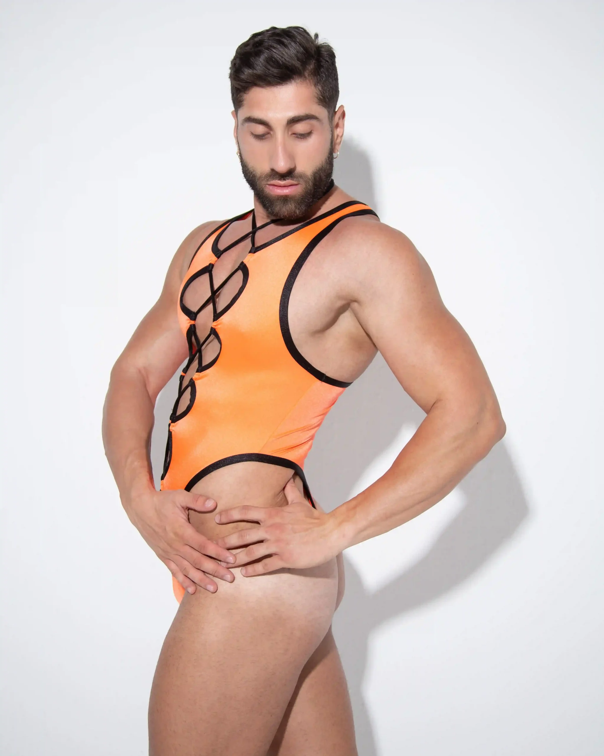 Bodysuit MAXX Naranja, Su diseño ajustado al cuerpo, resaltando las curvas de forma elegante y seductora. Las cuerdas añade un toque de misterio y provocación, ya que revela partes estratégicas del cuerpo de manera sugerente.