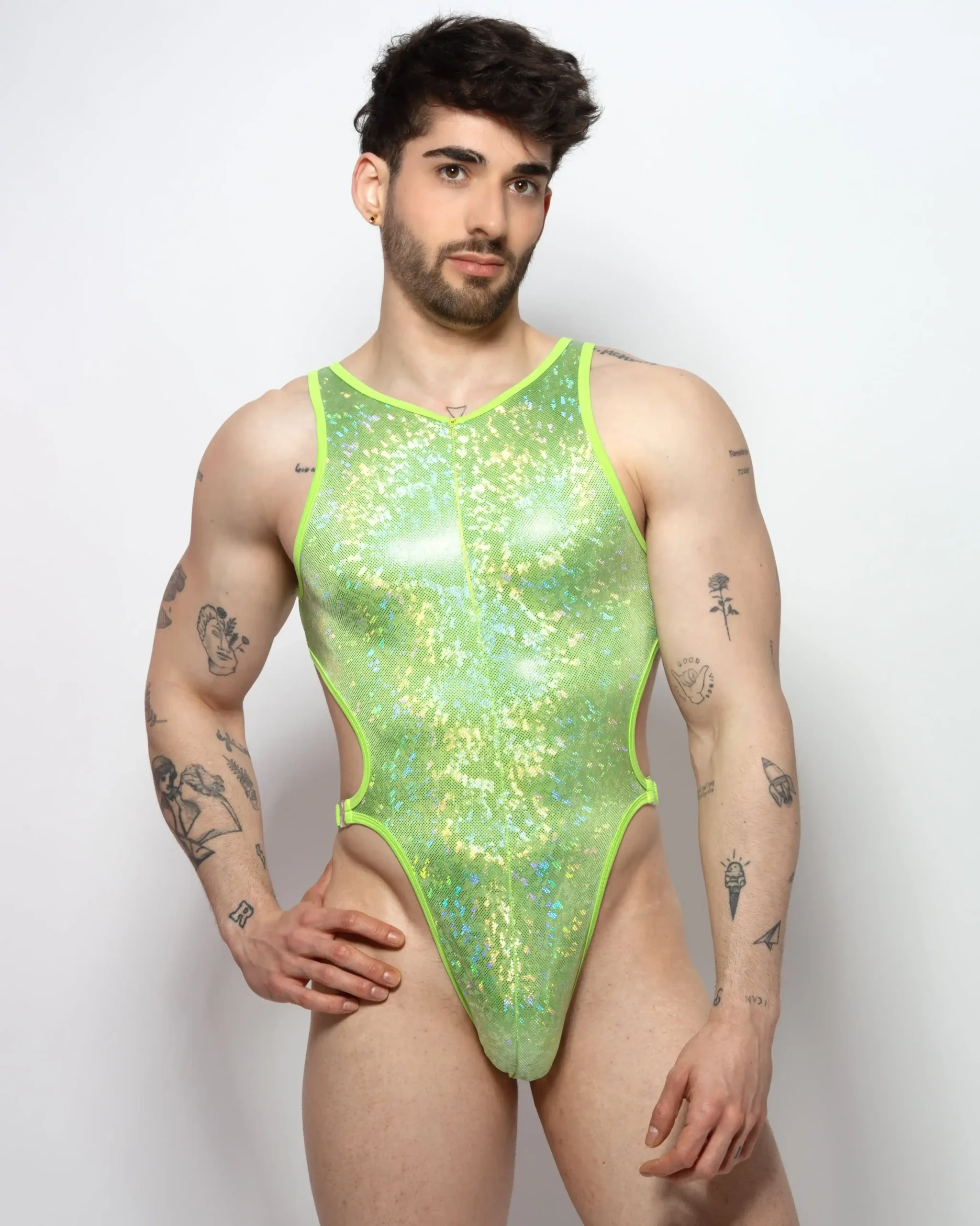 Bodysuit VULCANO Verde holográfico con cremallera frontal, CON CLIP LATERALES