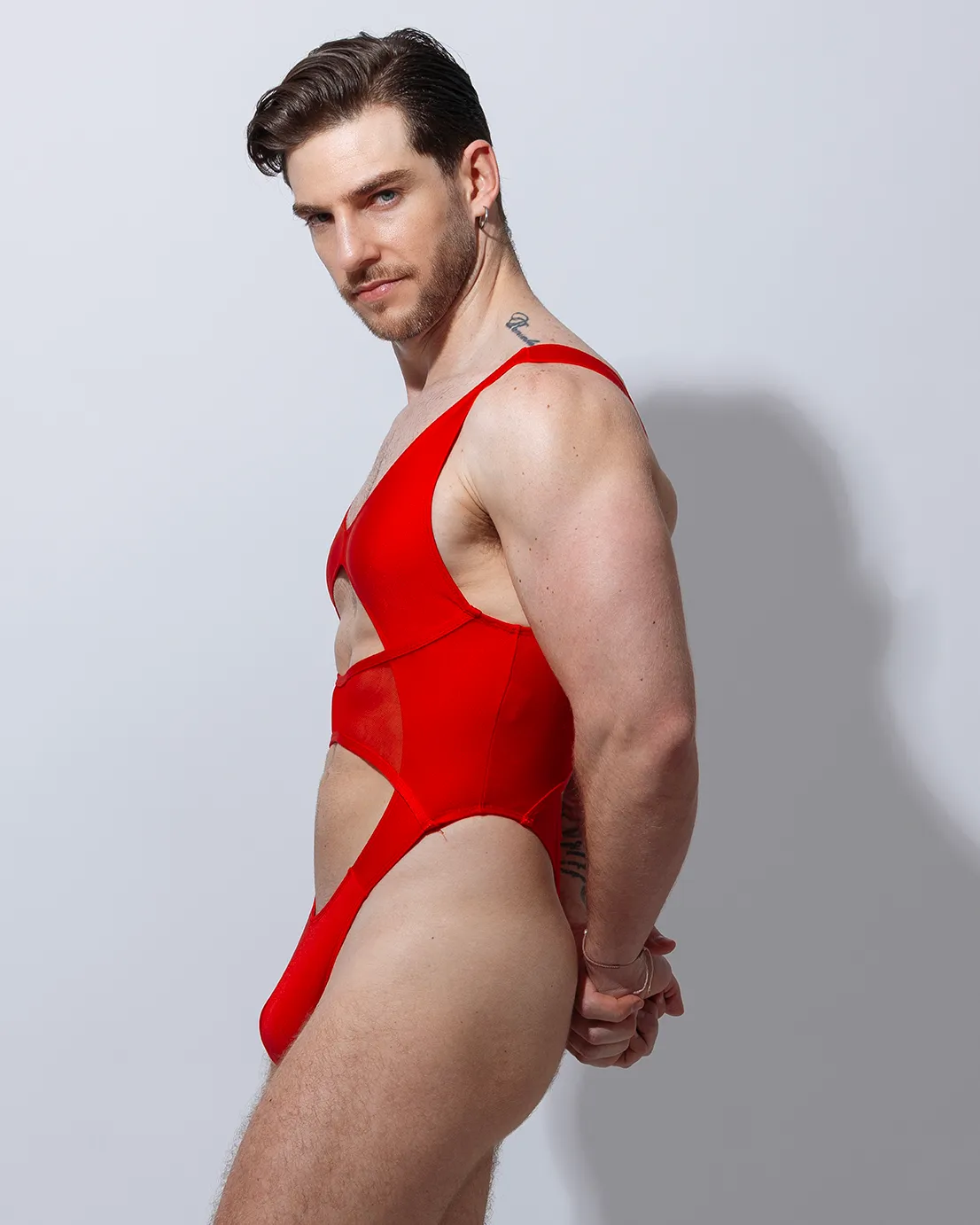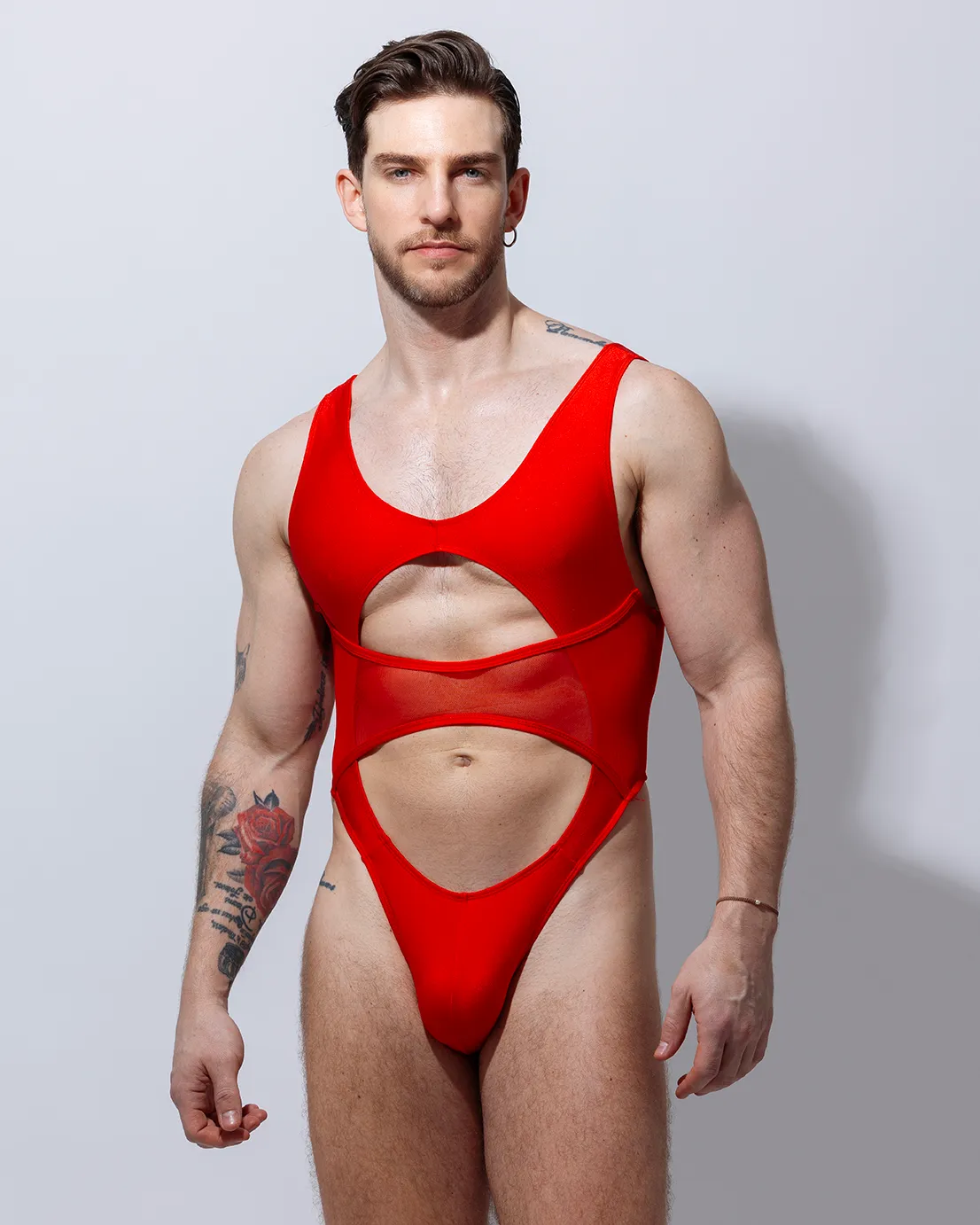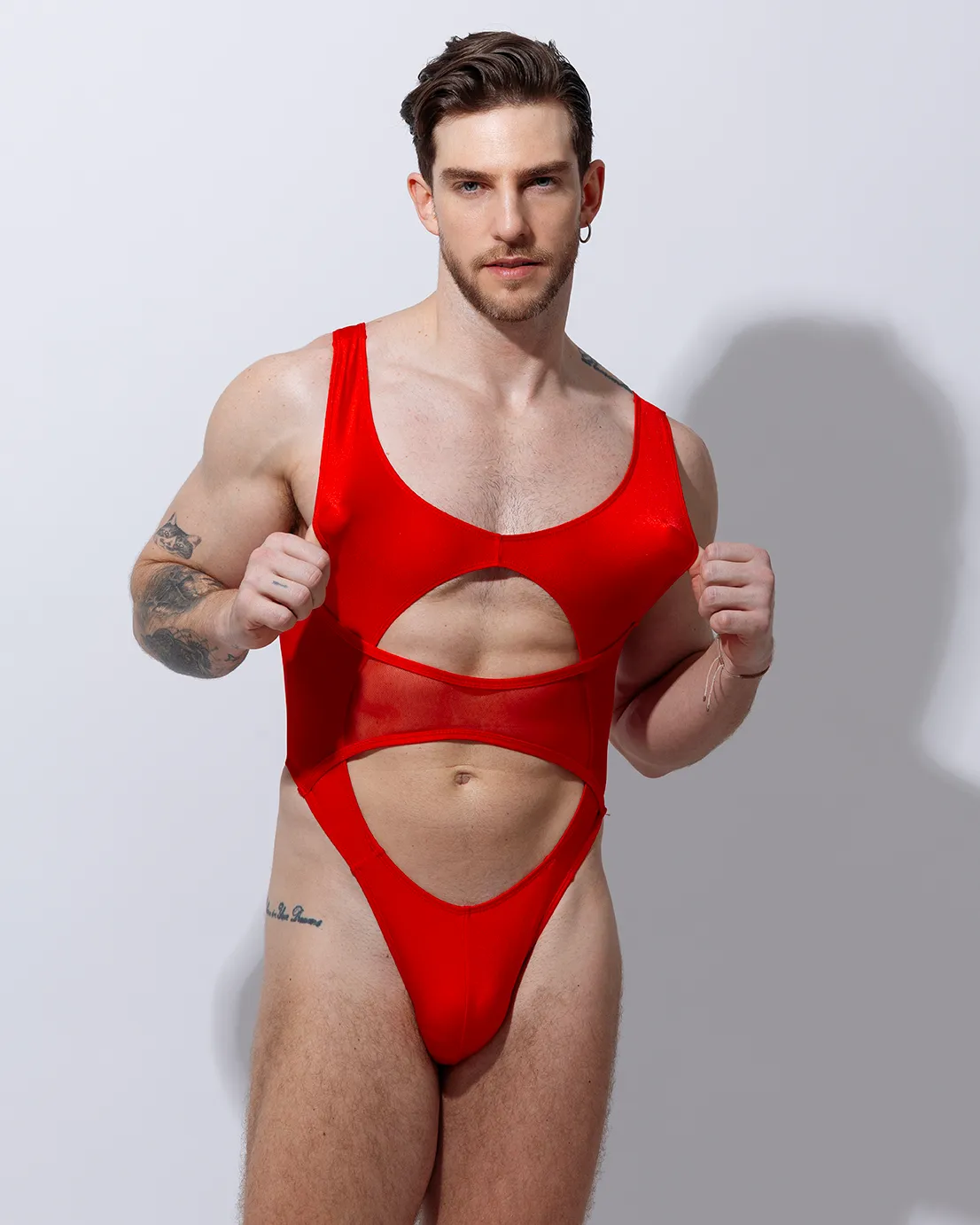 Trikini con detalle de transparencia y sobreposición, es una prenda ajustada que moderniza la figura masculina con estilo audaz y moderno, perfecto para seducir.